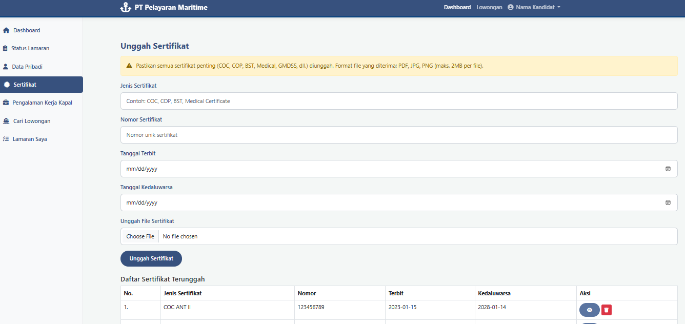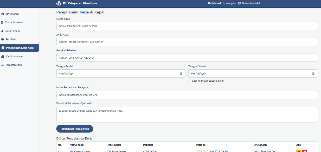 - Manajemen Sertifikat & Pengalaman Kerja: Fitur untuk mengunggah dan mengelola daftar sertifikat kemaritiman serta detail pengalaman kerja di kapal.