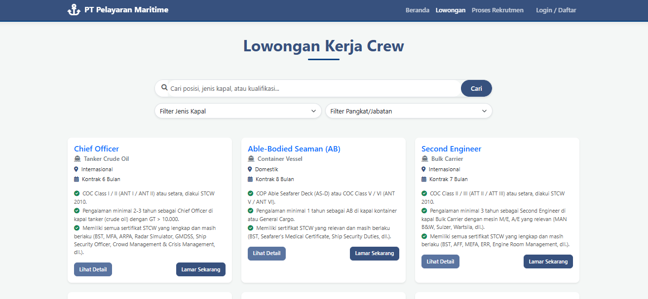 - Portal Lowongan Kerja: Menampilkan daftar lowongan kerja crew yang tersedia dengan detail lengkap, filter pencarian berdasarkan jenis kapal, pangkat/jabatan, dan lokasi.